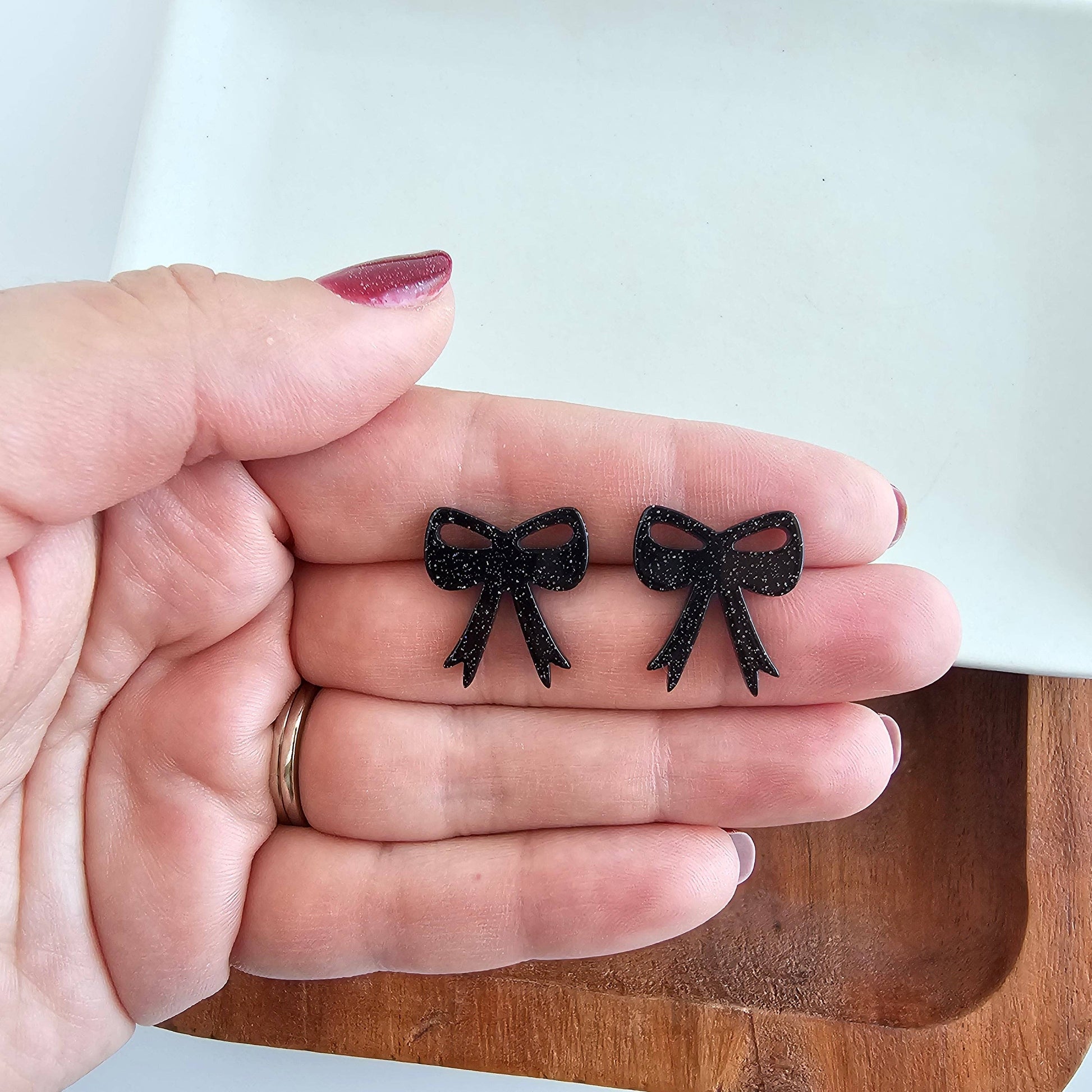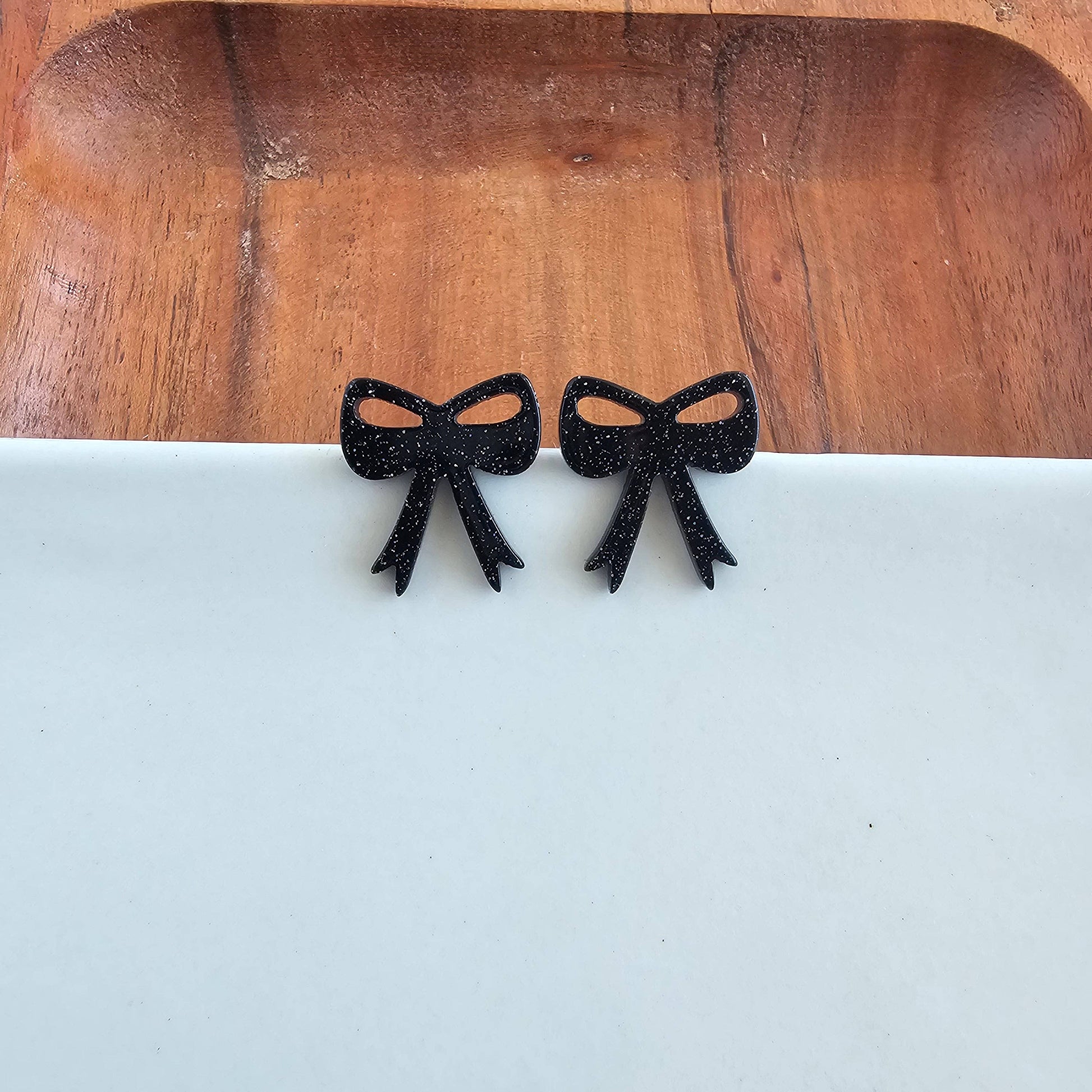 Style meets spooky with these black glitter bow studs. Get ready to slay the day with these wickedly cute earrings.