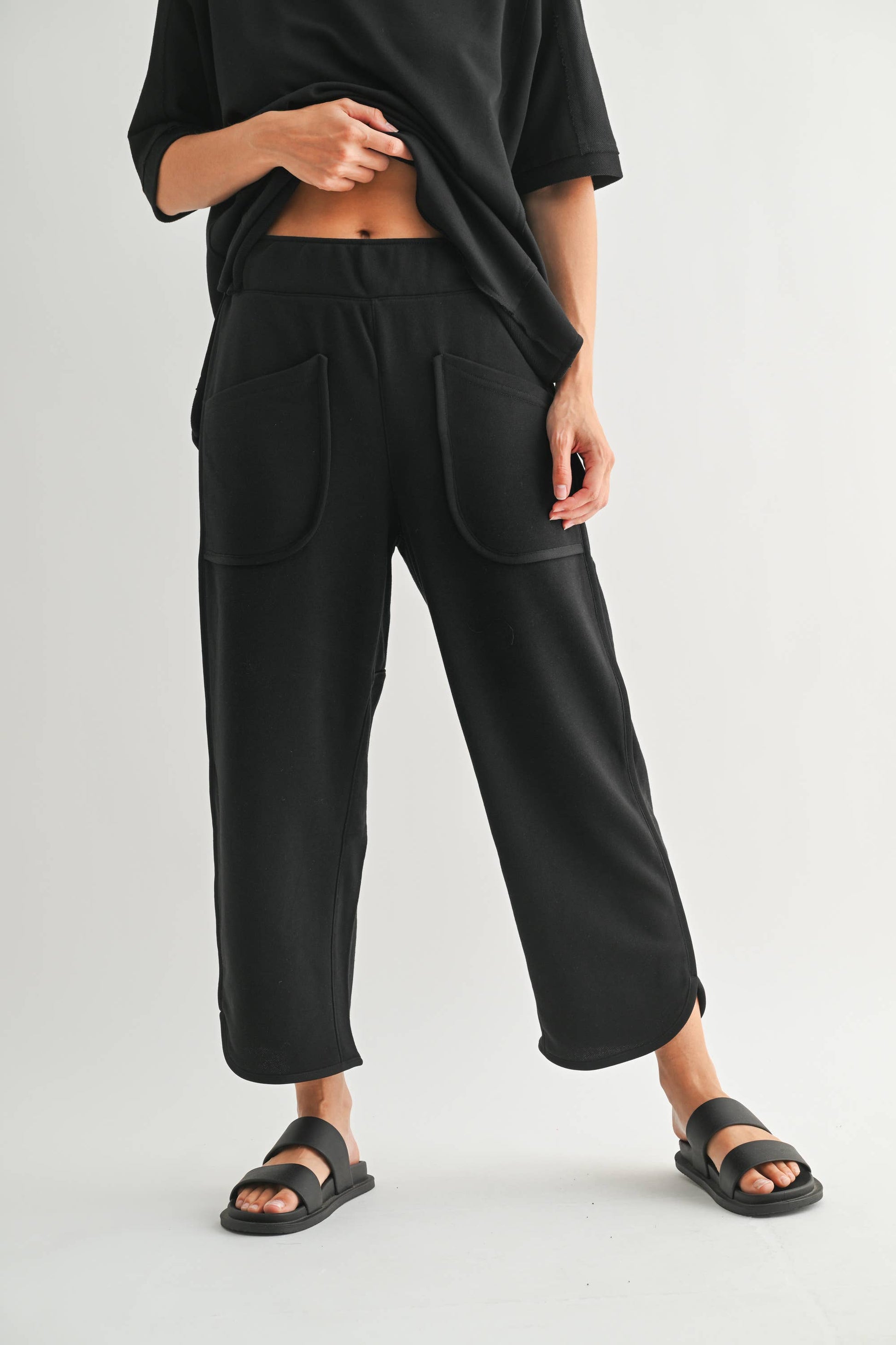 Easygoing and effortlessly cool, the Dune Drift Curved Cropped Pants is your new go-to for laid-back days. Made from a soft cotton blend, these wide-leg pants feature oversized front bucket pockets, a comfy elastic waistband, and a relaxed cropped fit. The leg tapers slightly at the ankle with a subtle curved side hem for a touch of shape and movement. Whether you're lounging or stepping out, these pants bring comfort with a casual, lived-in charm.