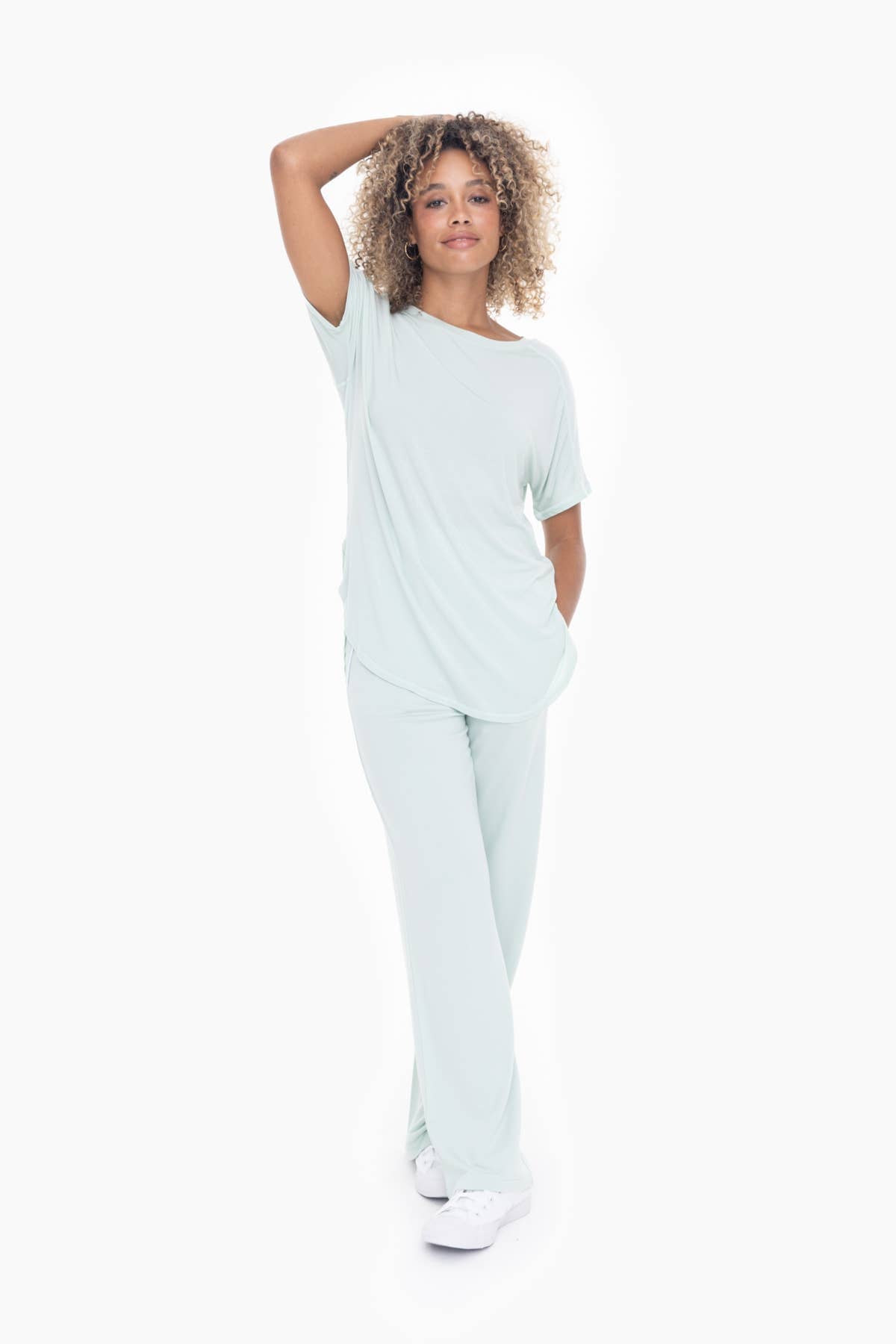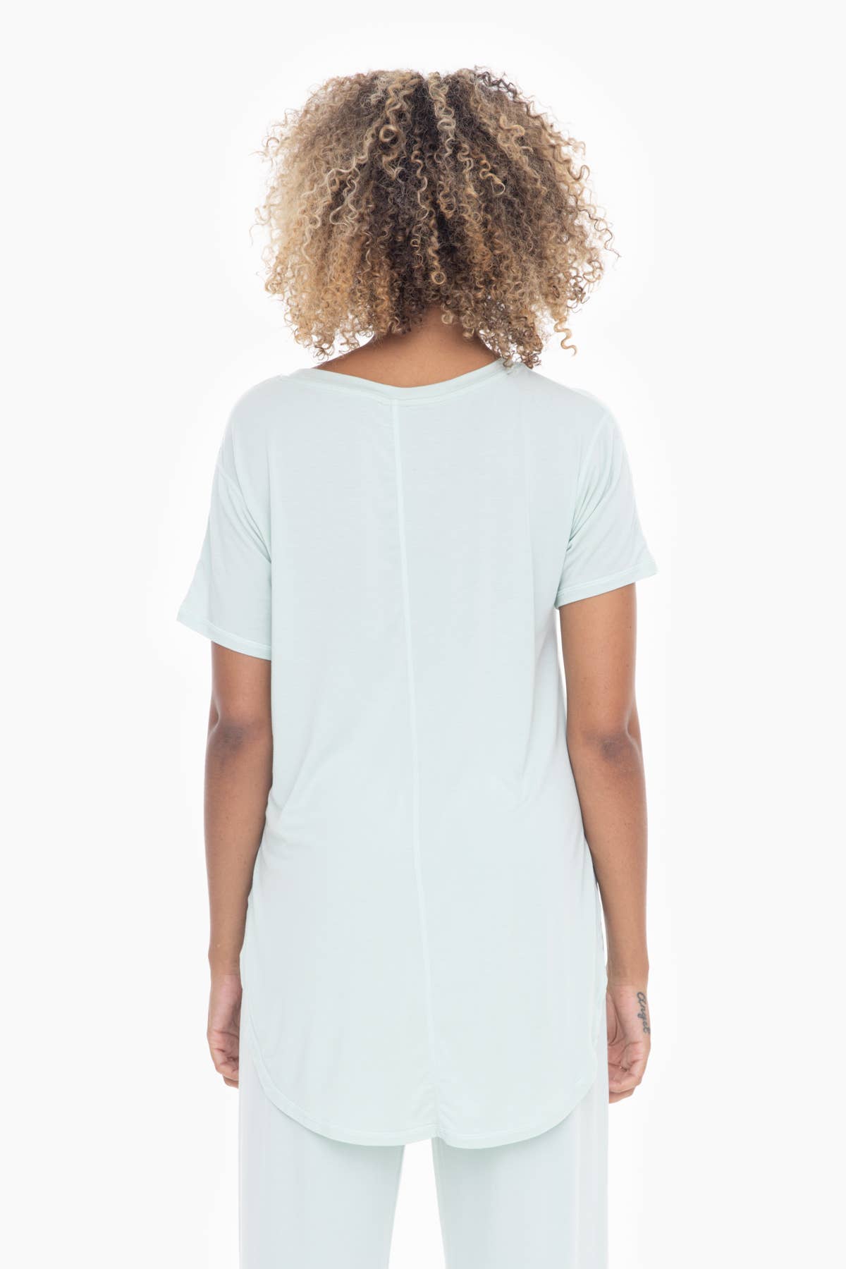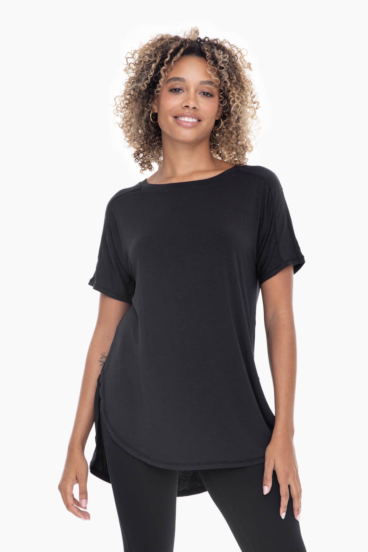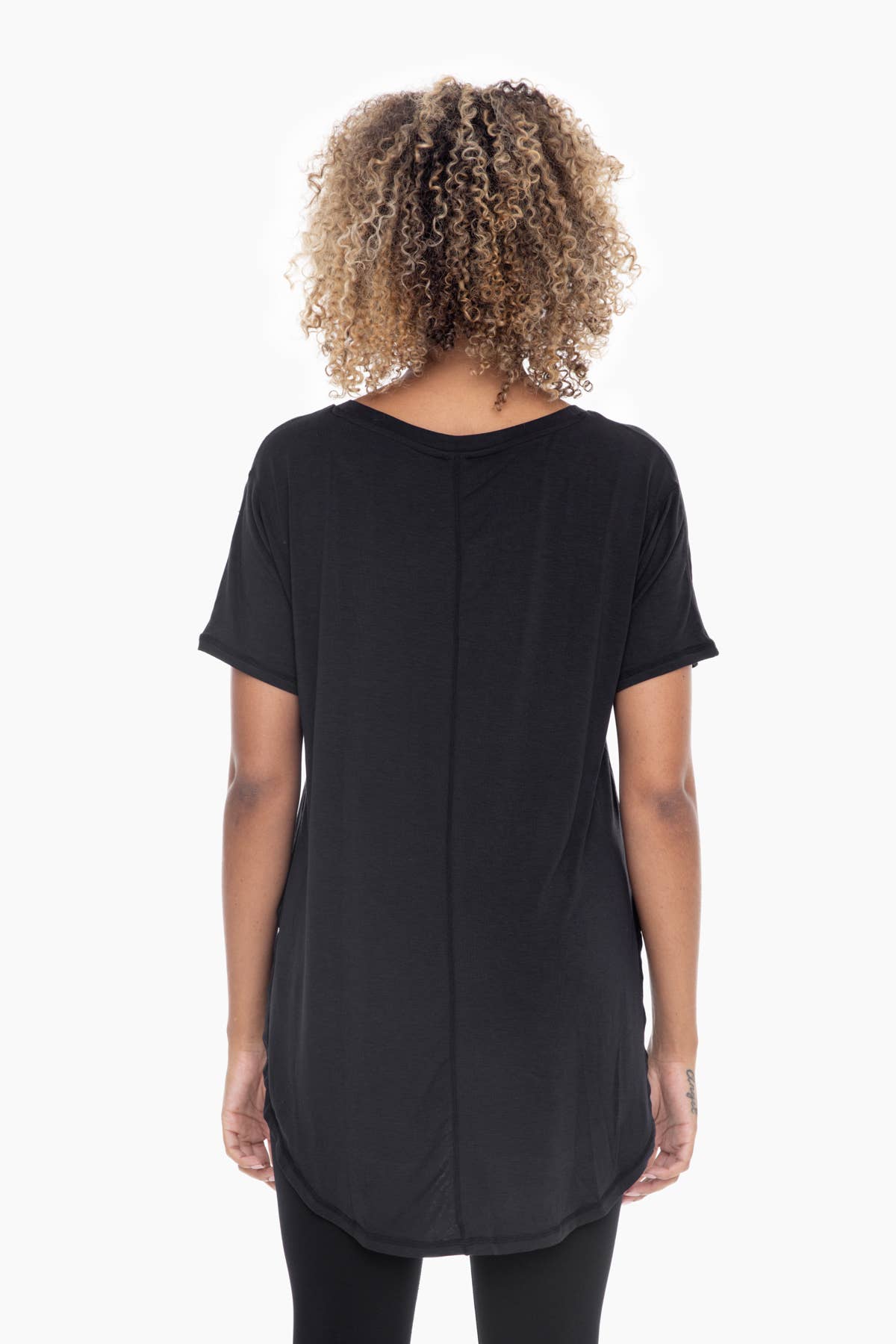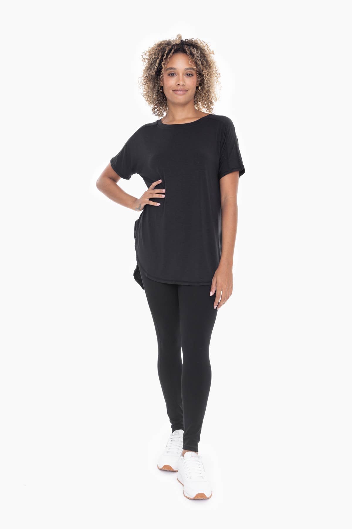Give your basic t-shirt an added dose of edge. This loose fit tee is crafted from a soft & drapey model blend jersey and features a high-low shirttail hem and dolman sleeves for extra comfort and mobility. Maya, is 5'7", a size 4, and is wearing a size Small. Fabric: 67% modal 28% nylon 5% spandex. Made in China.