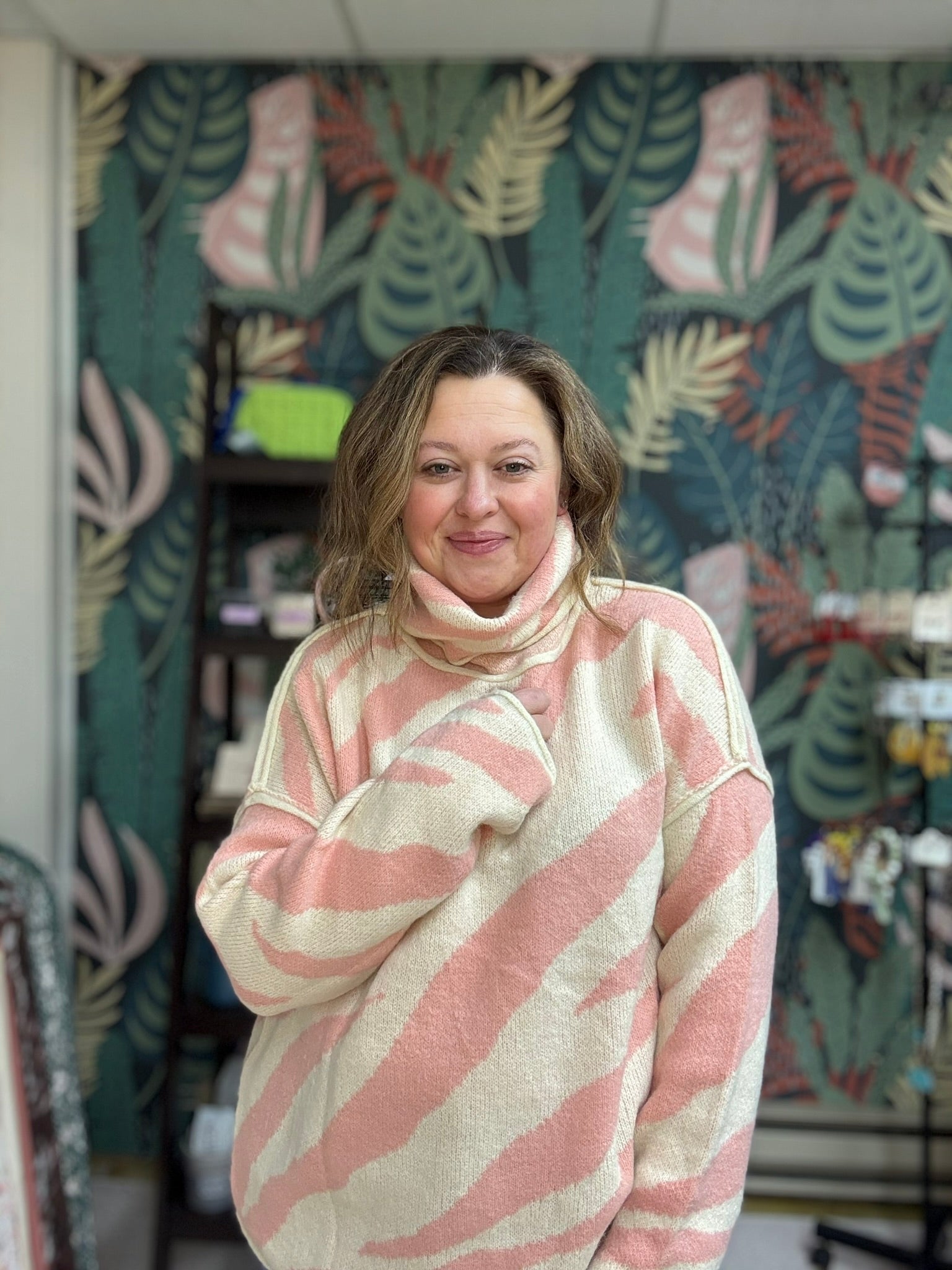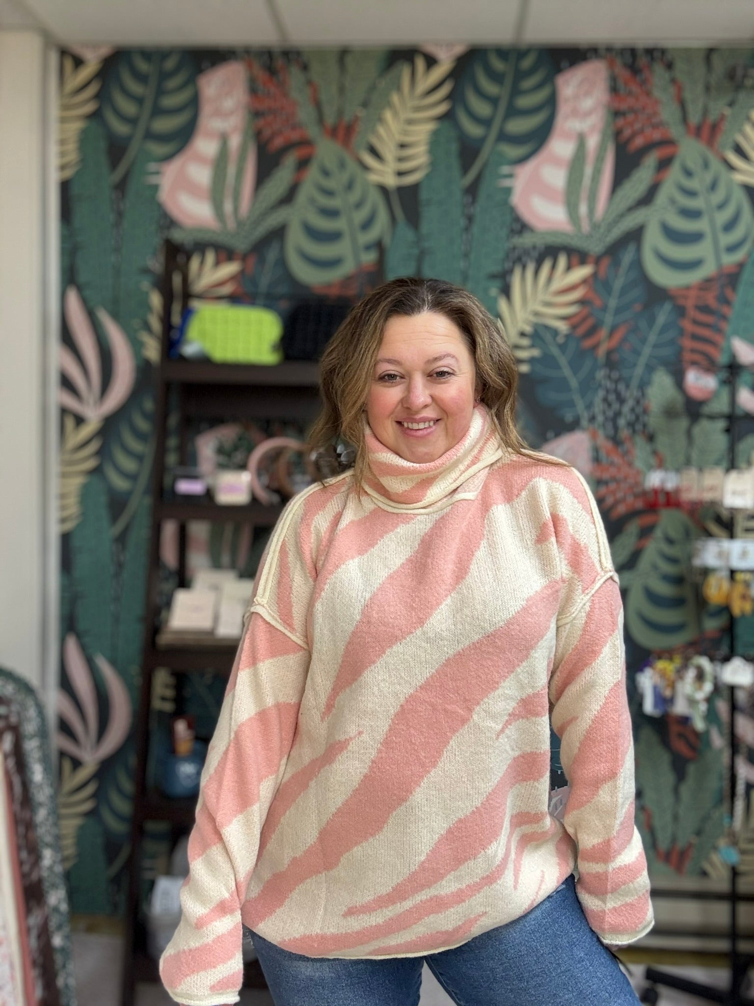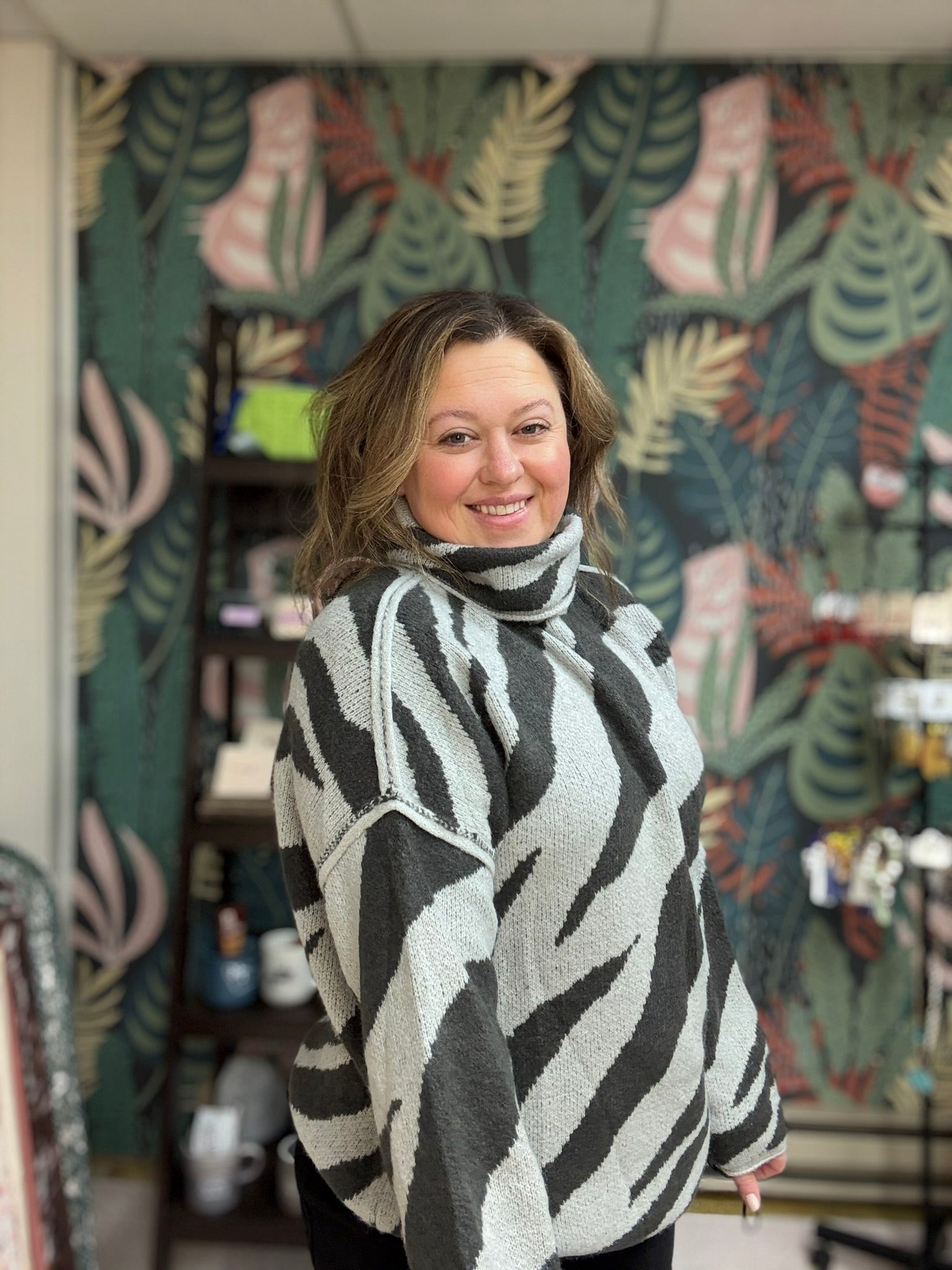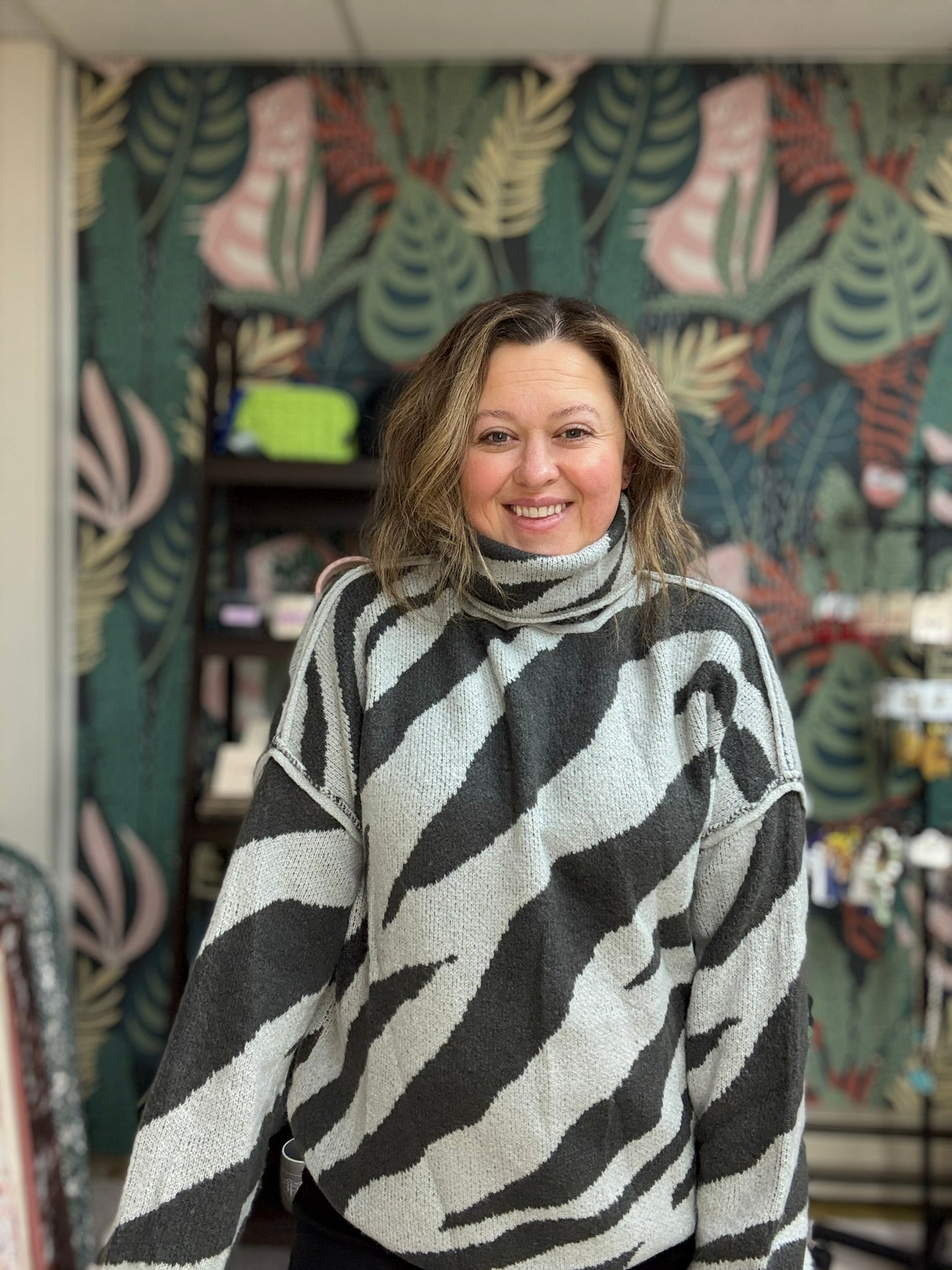 Softest fabric in this cute zebra turtle neck sweater. Very cozy! Flezible sizing, will fit S/M and up to a large.